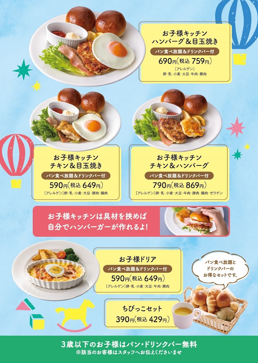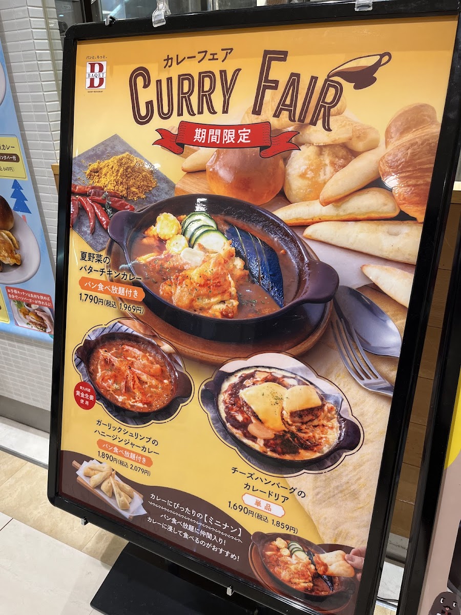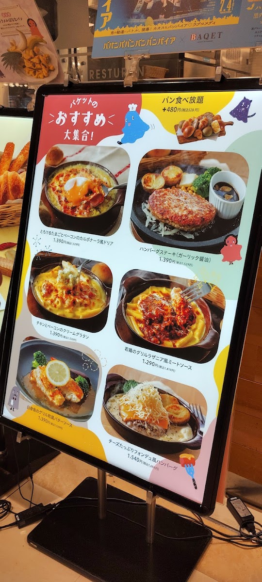 The menu at Baqet Tokyo offers a delightful variety of dishes that cater to a wide range of tastes, making it a perfect spot for a satisfying meal. 焼き立てパン 食べ放題, or freshly baked bread with unlimited refills, is a standout feature, allowing guests to enjoy warm, soft bread with every course. For a hearty main dish, the カルボナーラ風ドリア (Carbonara-style Doria) is a creamy, indulgent option, while the チーズハンバーグ (Cheese Hamburger) offers a juicy patty topped with melted cheese, perfect for those craving a savory, satisfying bite.